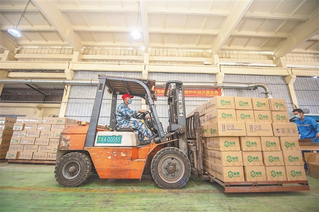 3月1日,在儋州海南農墾寶聯林產有限公司內,工人們身著制服、戴著口罩,將一塊塊木板胚料制成大小均等、色澤相近的木地板條。