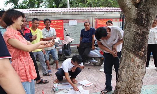 為了檢驗(yàn)?zāi)z農(nóng)一天來的割膠技術(shù)成績和收獲, 當(dāng)天下午, 還對膠農(nóng)中線、低線和陰線割膠技術(shù)進(jìn)行實(shí)操測試。