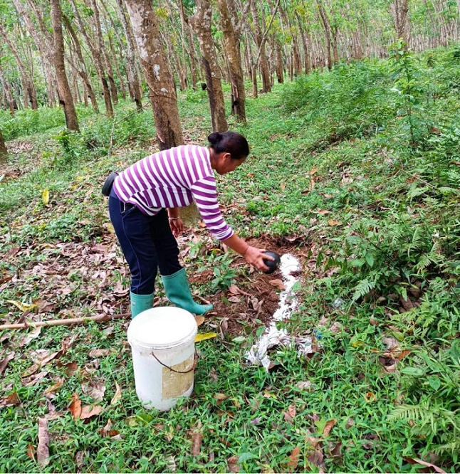 在膠園里,和韋芳想法相同的膠工不少。膠園里熱火朝天,膠工們在做好疫情防控的基礎上,手持膠刀細心割膠,滿頭是汗。林子里切割樹皮的聲音不時沙沙作響。