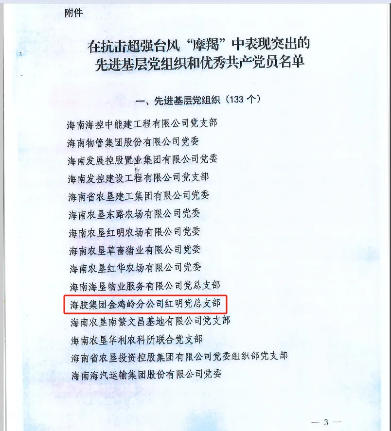 海南橡膠多個基層黨組織和黨員榮獲海墾集團抗擊超強臺風“摩羯”中表現突出的先進基層黨組織和優秀共產黨員榮譽稱號